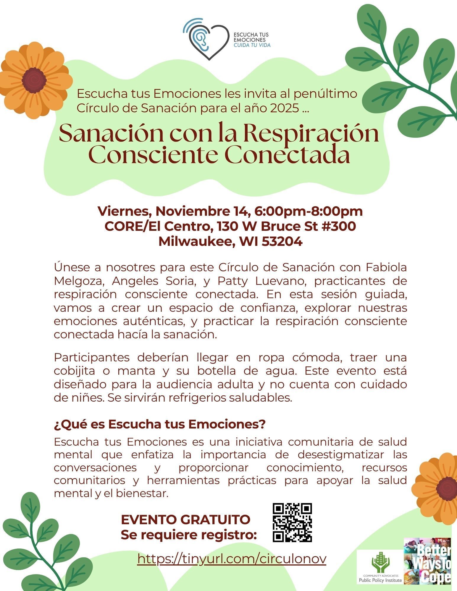 Únese a nosotres para este Círculo de Sanación con Fabiola Melgoza, Angeles Soria, y Patty Luevano, practicantes de respiración consciente conectada. En esta sesión guiada, vamos a crear un espacio de confianza, explorar nuestras emociones auténticas, y practicar la respiración consciente conectada hacía la sanación.