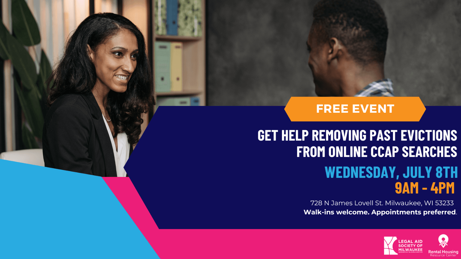 Legal Aid Society of Milwaukee has partnered with the Rental Housing Resource Center (located inside the Community Advocates building) to help individuals currently looking to remove past evictions from their CCAP search. This free clinic will be held from 9 a.m. to 4 p.m. This event is currently open to individuals with dismissed evictions and completed payment plans only. Only open to Milwaukee County.