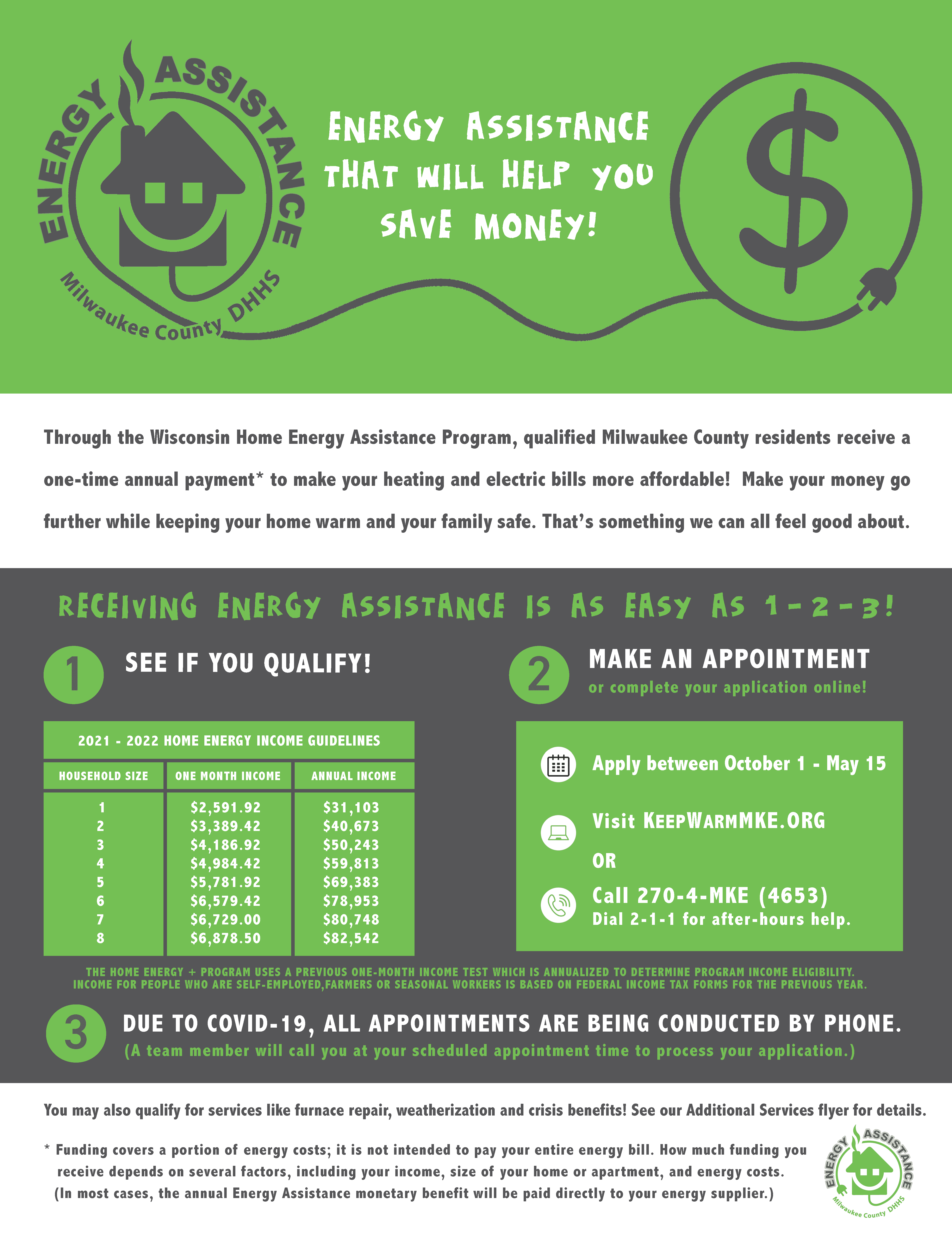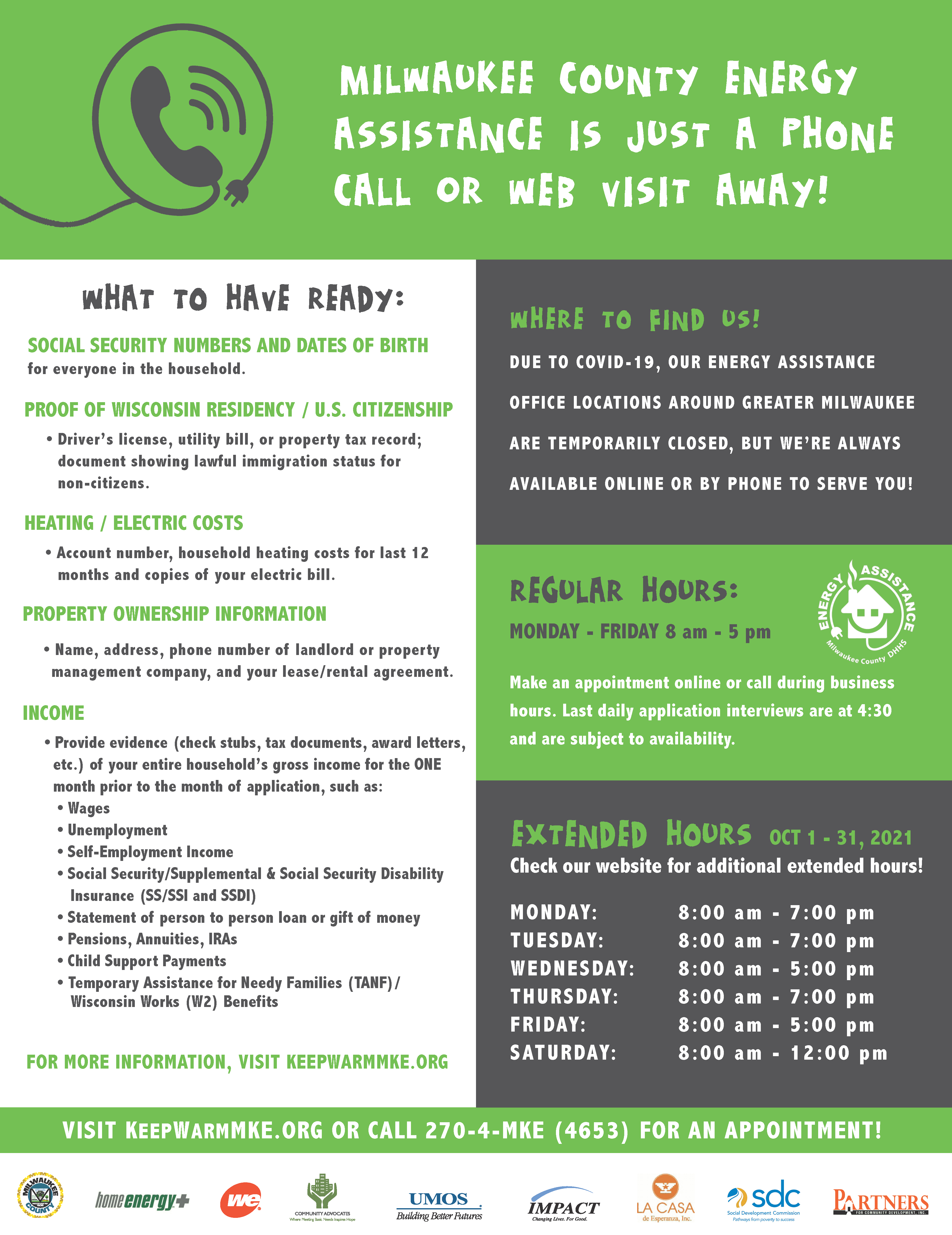 The Milwaukee County Energy Assistance team is ready to help you apply for the program. You can schedule a phone appointment online at KeepWarmMKE.org or by calling 414-270-4653. During the coronavirus public health emergency, we are only taking phone appointments or you can apply online at this link. Our application sites are temporarily closed.
